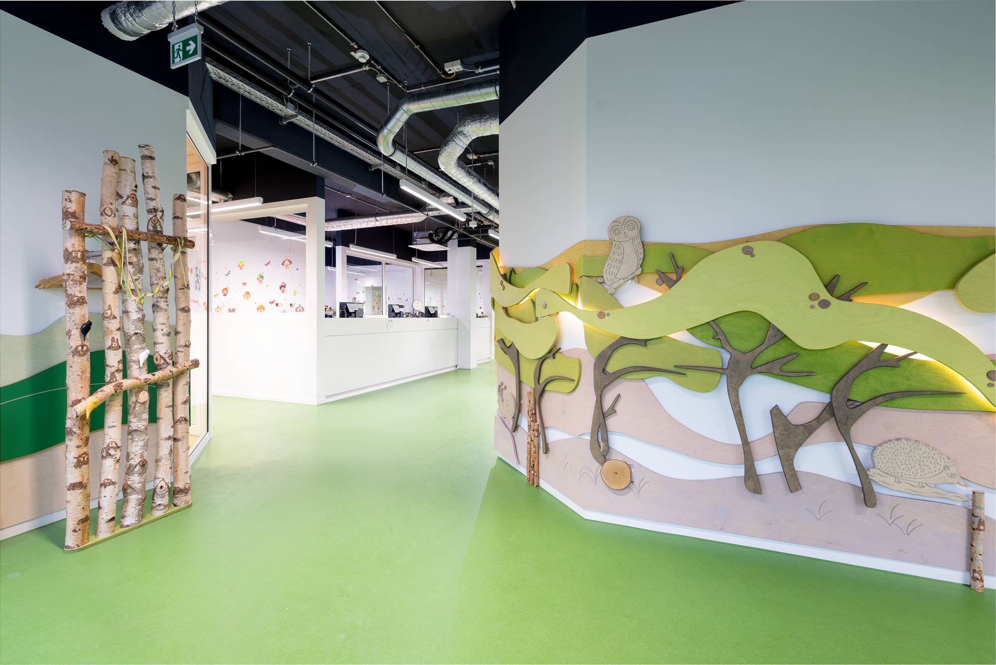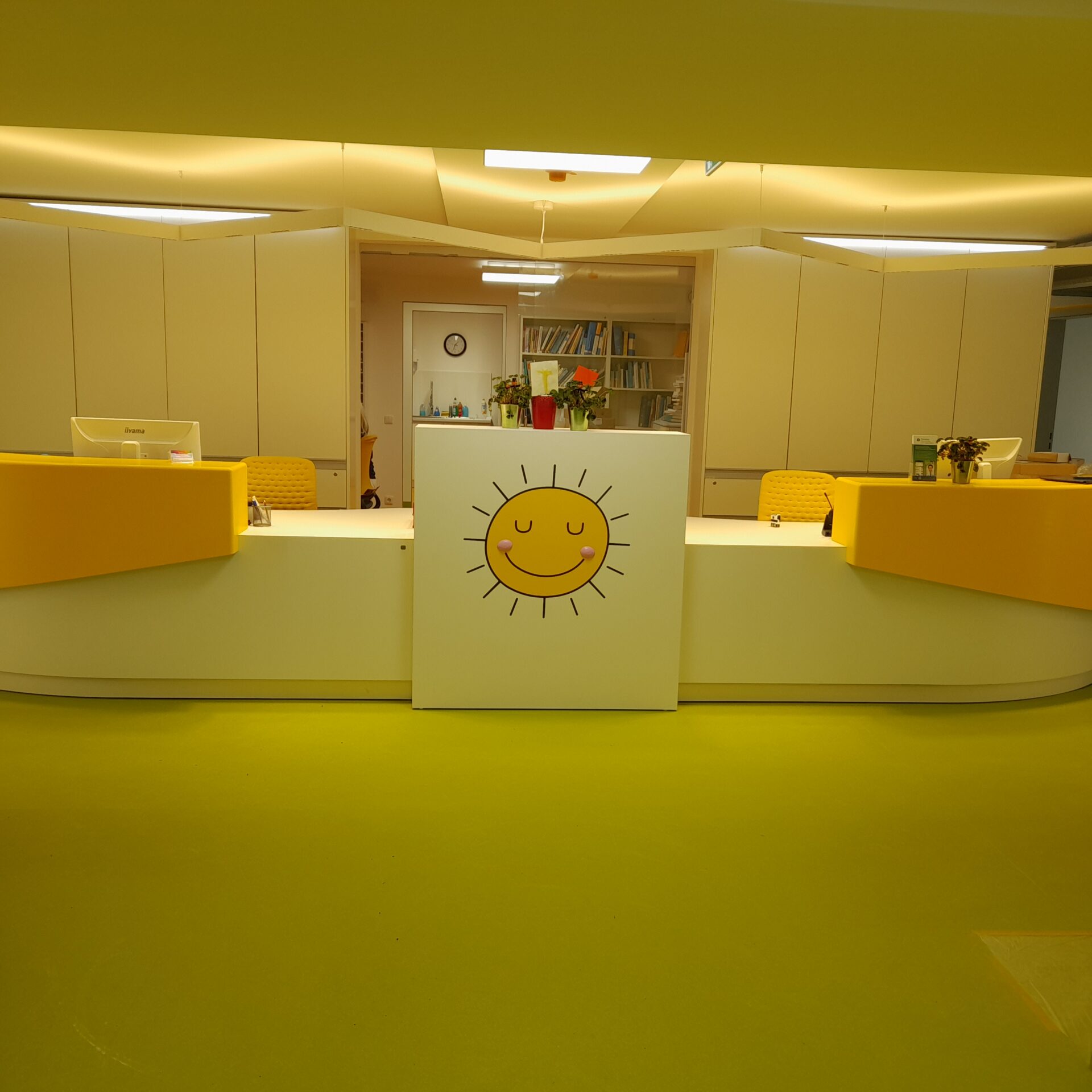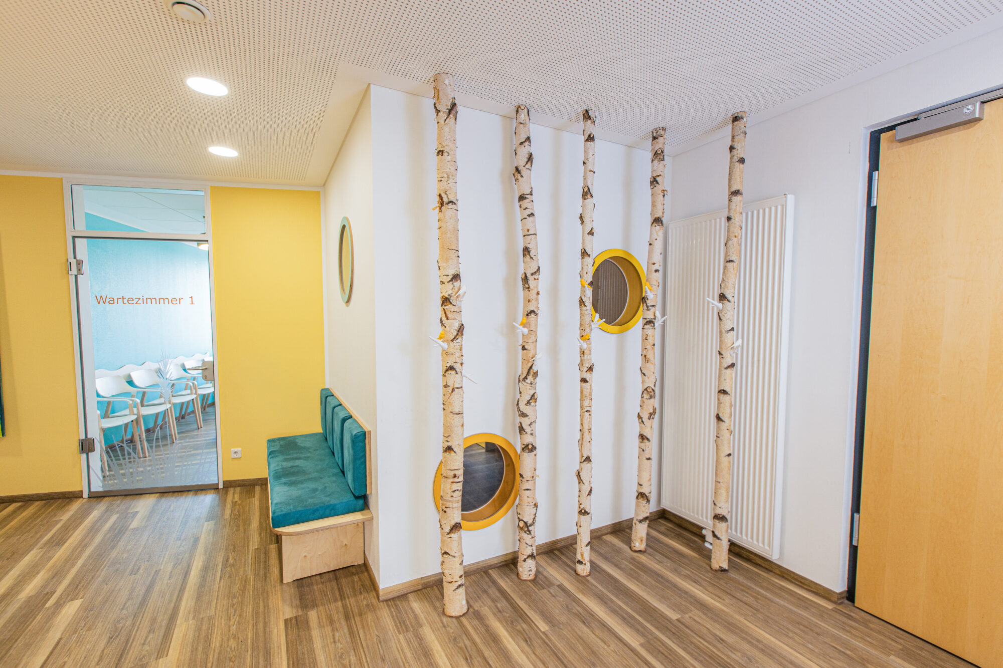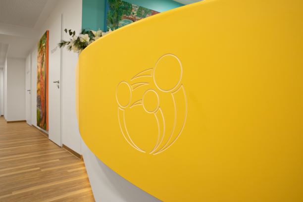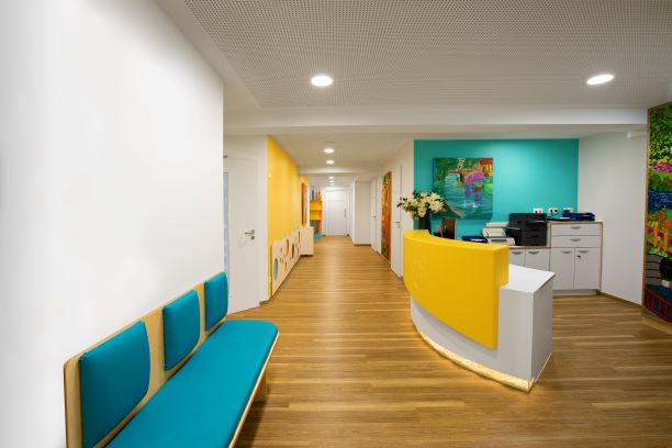 Wir spielen mit Farbe, Licht und Form und legen hier besonderen Wert auf die ästhetische und individuelle Gestaltung. Im Empfangsbereich finden sich die Anmeldetheke, ein definierter Platz für die Kinderwagen, das Gesamtmotiv der Praxis, eventuell Sitzgelegenheiten und Garderobe.