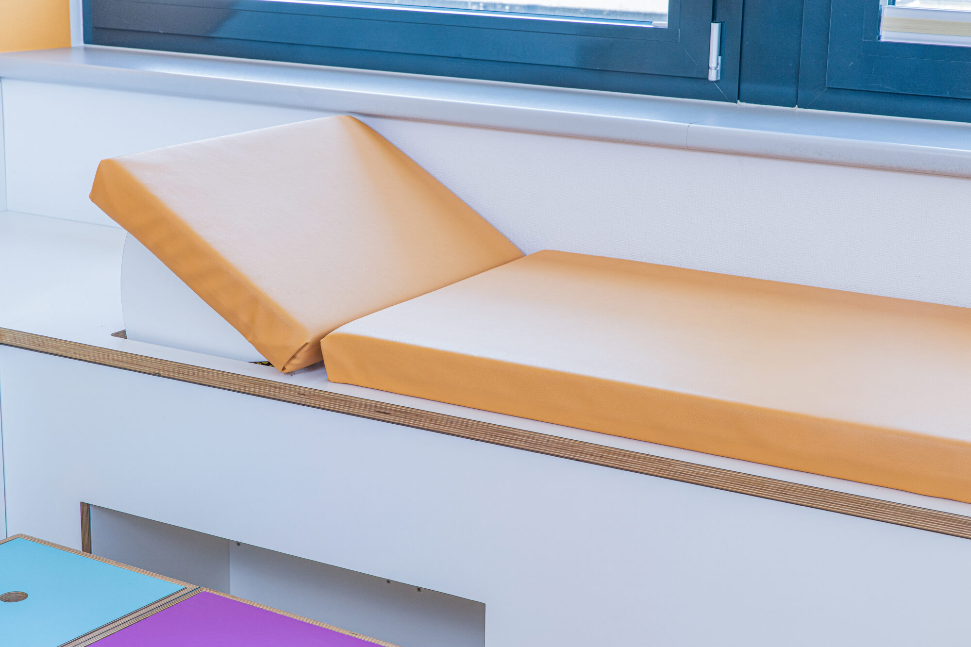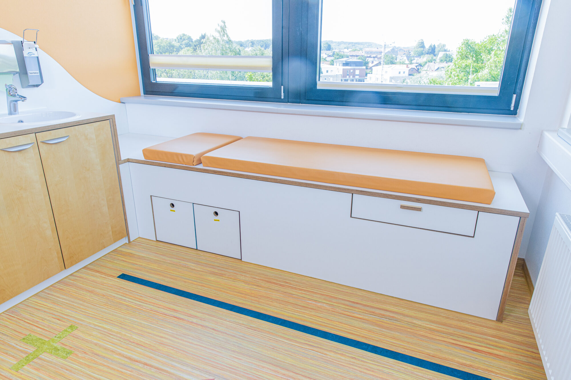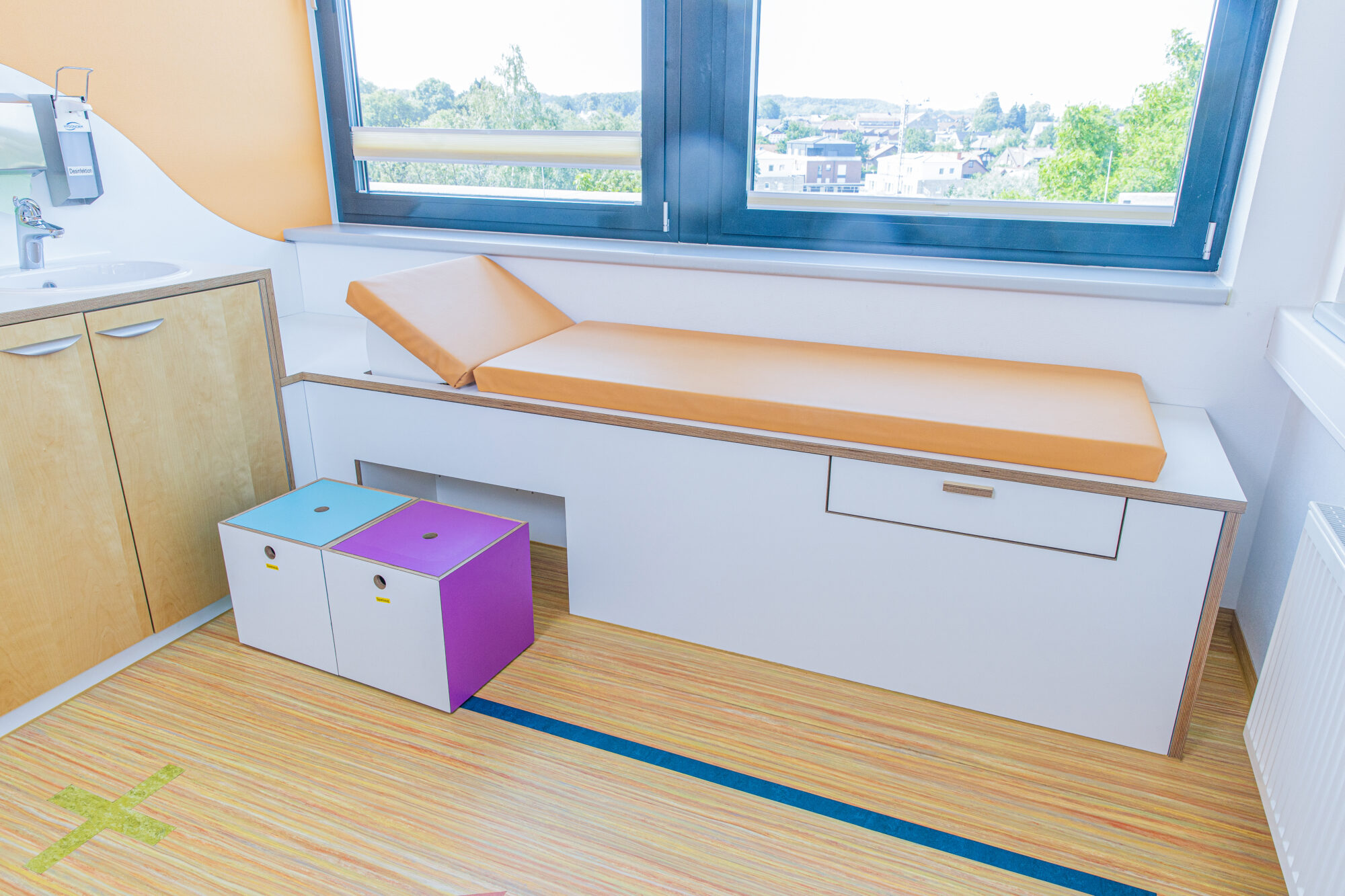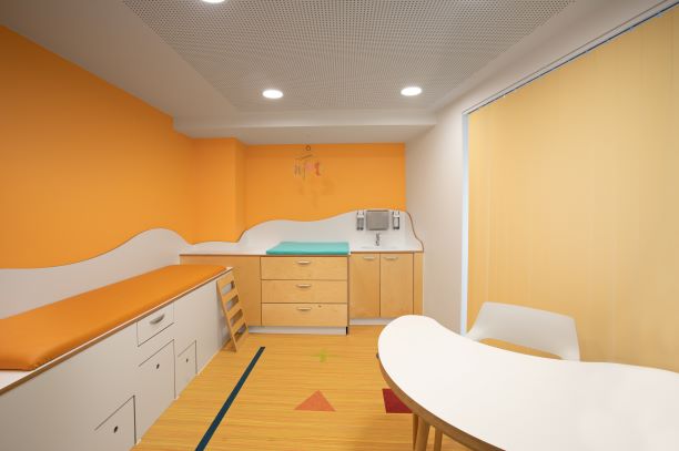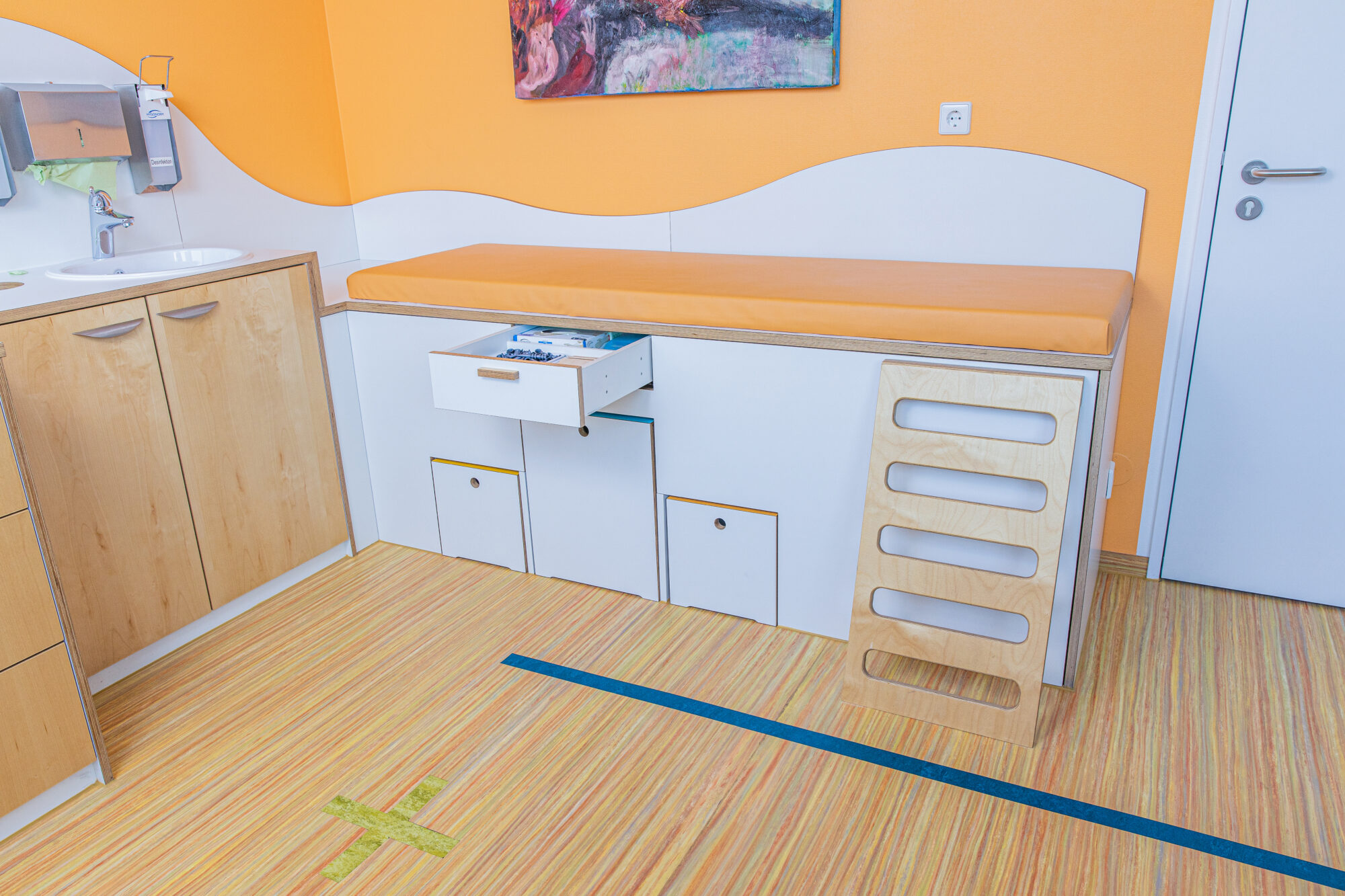 U-Untersuchungen unterstützen wir z.B. mit Intarsien im Boden oder einer Kletterleiter an der Untersuchungsliege. Für die feinmotorische Beobachtung kann aus der Liege Stuhl und Tisch herausgezogen werden zum Malen und Schreiben.