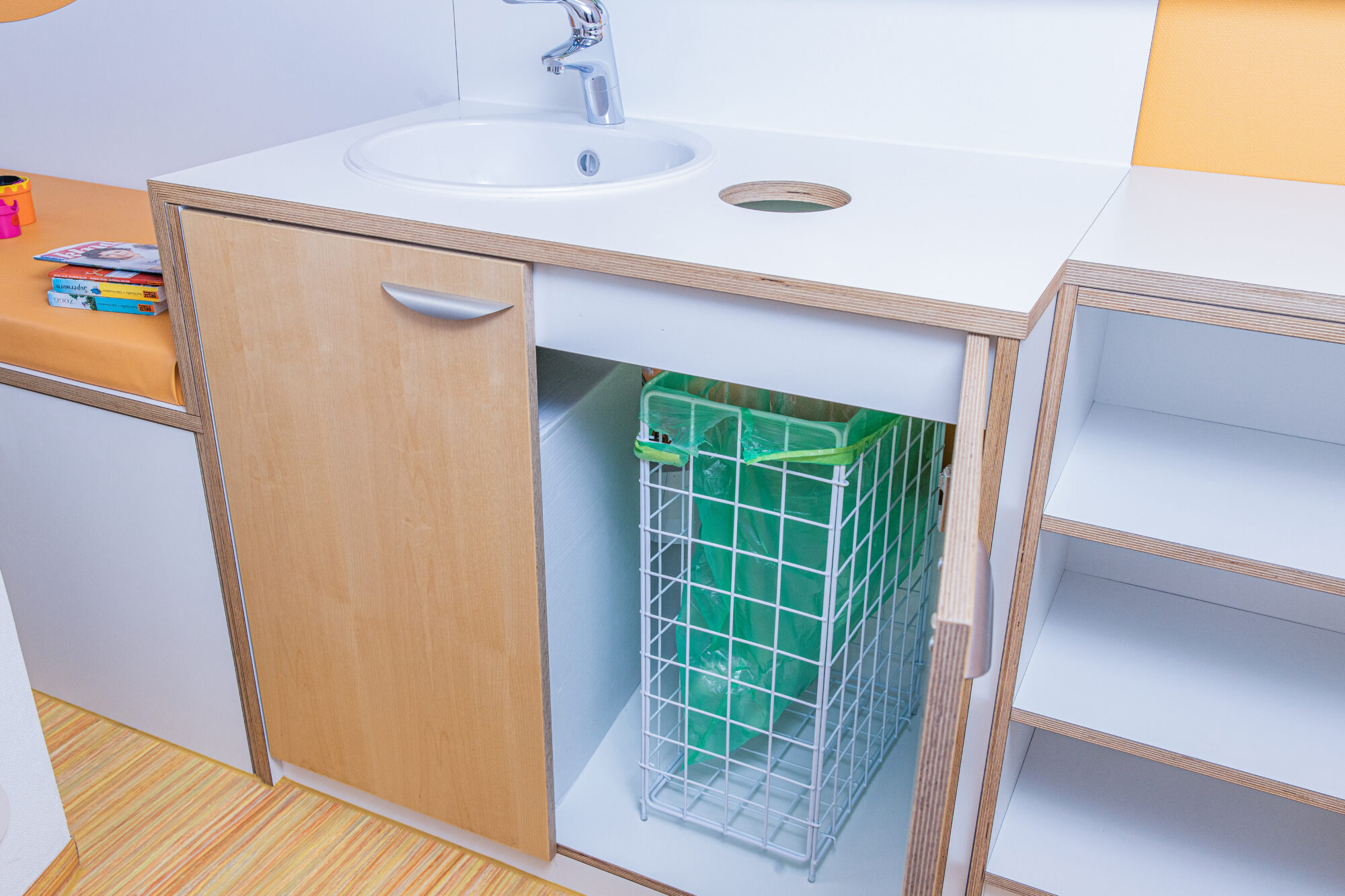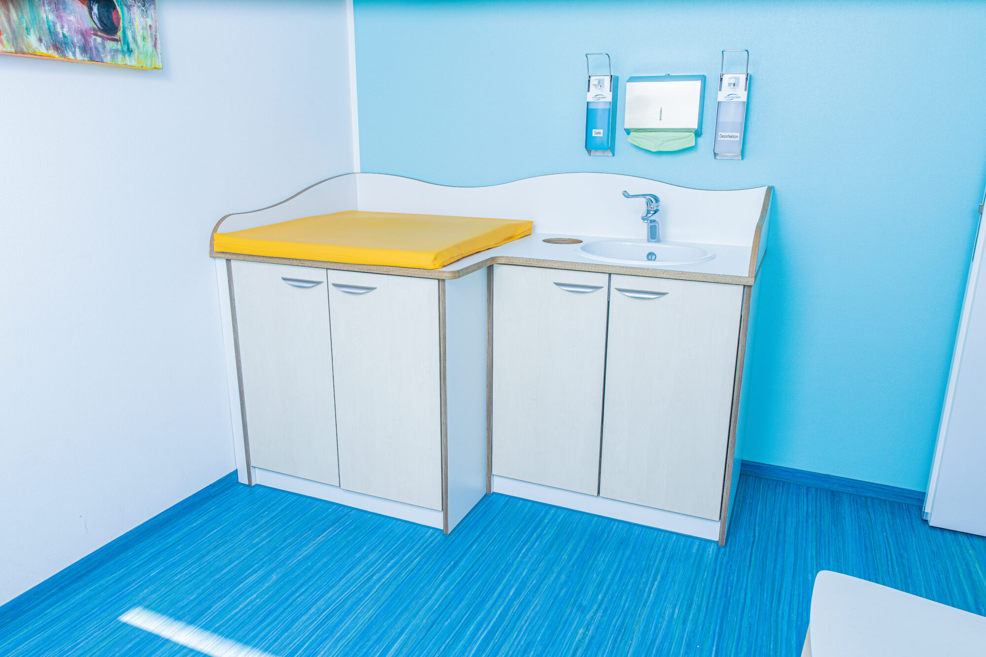 Untersuchungen für Säuglinge können rückenschonend am Wickeltisch vorgenommen werden. In den Wickeltisch integrieren wir die Babywaage und einen Messeinsatz für die Längenmessung.